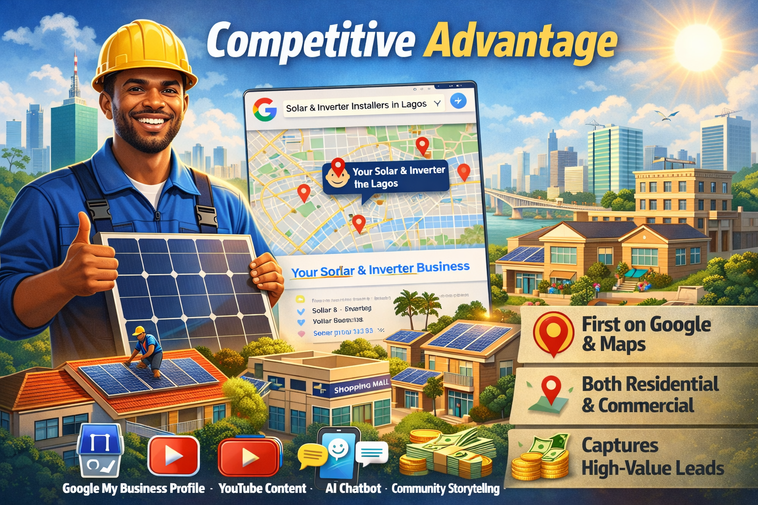 For solar and inverter businesses in Nigeria, Google My Business (GMB) is one of the most powerful yet underutilized tools for local lead generation. Most homeowners, real estate developers, hotel chains, and commercial property owners in Lagos search online for reliable solar and inverter services. If your business isn’t visible on Google Maps or local search results, you are missing out on high-value leads every day.